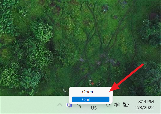 You can also try closing the Microsoft Teams entire and launching it again. Open the system tray or from the Taskbar corner, right-click the on Teams app icon and select ‘Quit’.