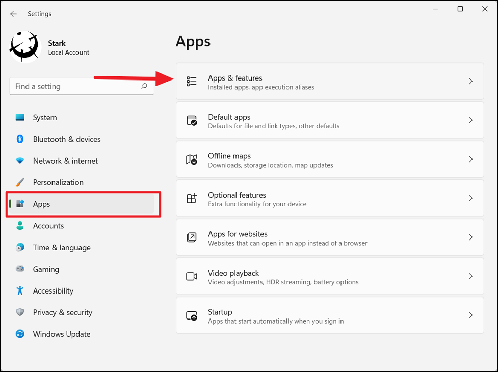 Next, open Windows Settings, click ‘Apps’, and select ‘Apps & features’.