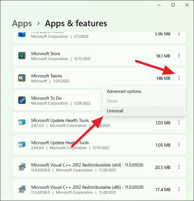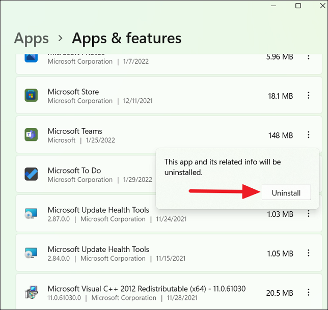 Then, choose the ‘Microsoft Teams’ app from the list of apps and select ‘Uninstall’.