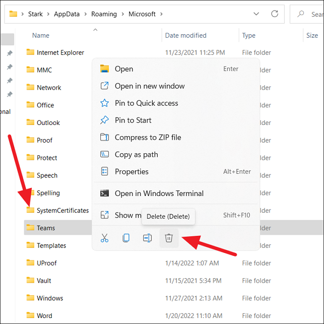 To do that, open the Run dialog box by pressing Win+R, then type %appdata% and press Enter. Then navigate to the ‘Microsoft’ folder and if you see the ‘Teams’ folder in there, right-click on the ‘Teams’ folder and select ‘Delete’. Then, close the folder.