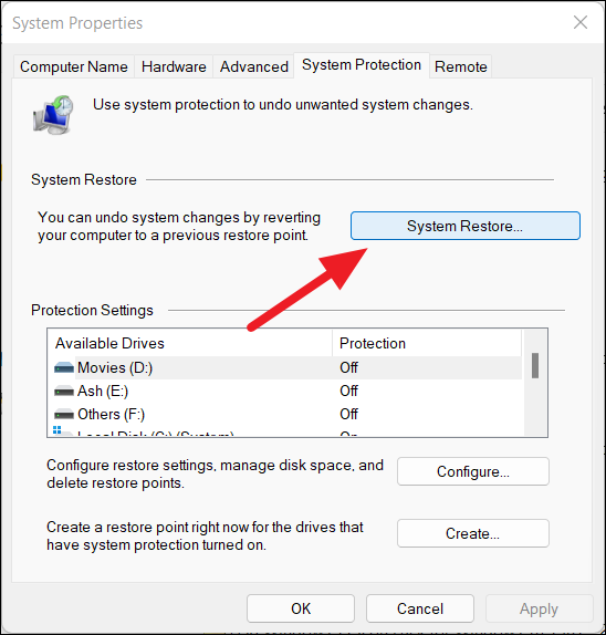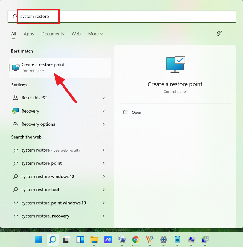 First, search for ‘System restore’ in the Windows search and select ‘Create a restore point’ control panel.