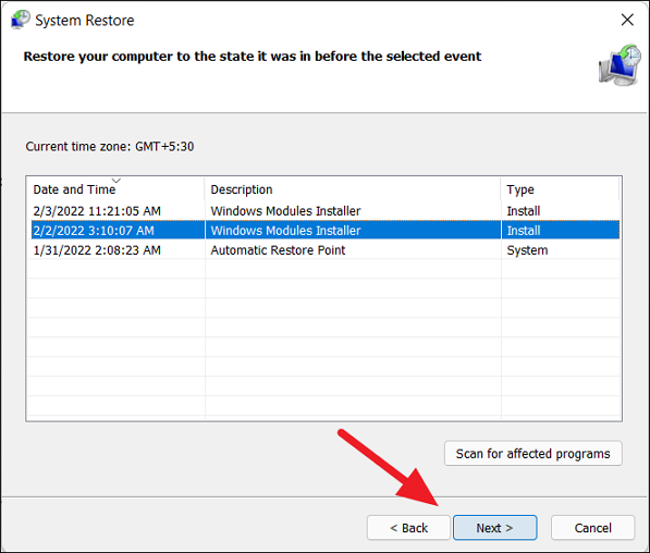 In the next screen, choose an automatically or manually created restore point from the list, and click ‘Next’. Make sure you choose a restore point that was created before you started experiencing the microphone problem.