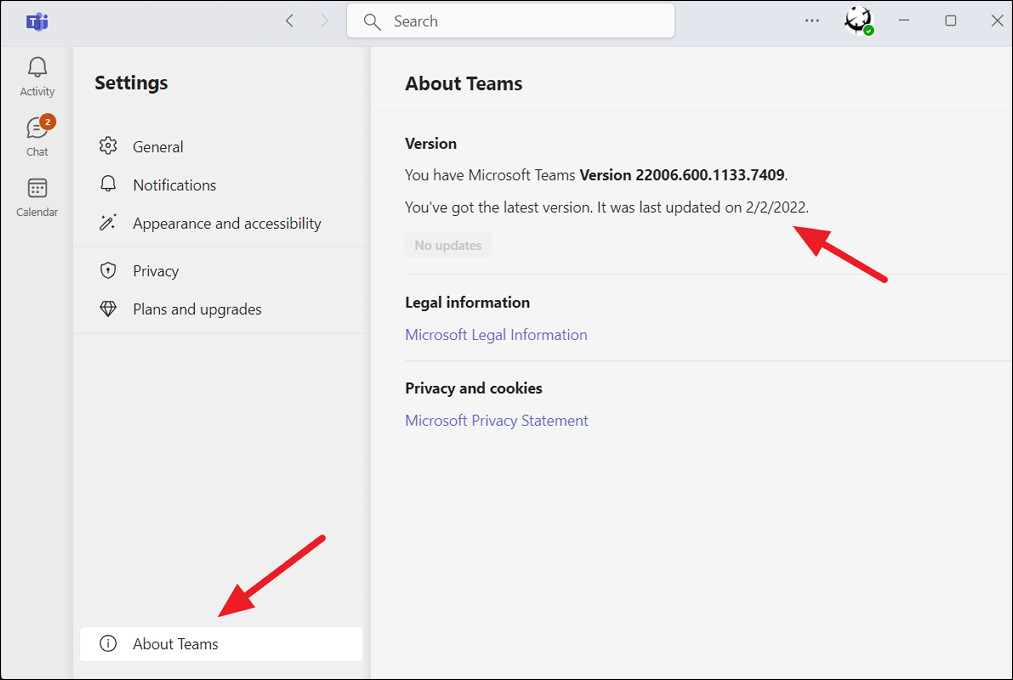 On the bottom of the left panel, click the ‘About Teams’ option and if you see the ‘Check for Updates’ button on the right, click on it.