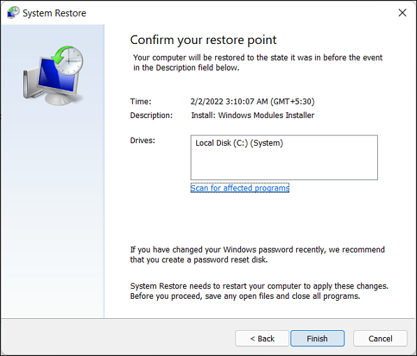 Finally, click ‘Finish’ to start the process. Now, your system will restart to apply the changes. Make sure to save your work and close all programs before continuing this process.
