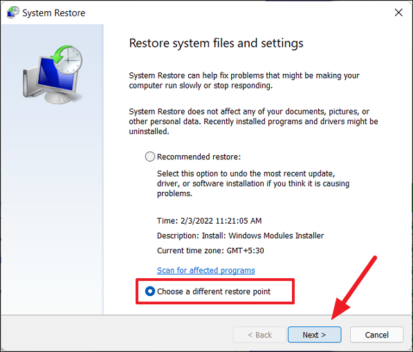 In the System Restore Windows, select the ‘Choose a different restore point’ option and click ‘Next’.