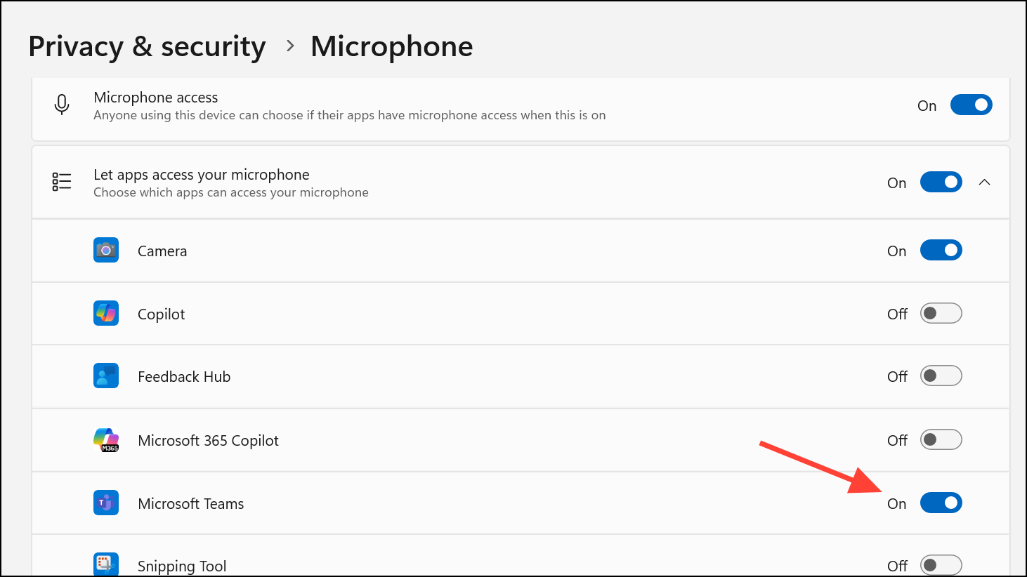 Step 2: Confirm that Microsoft Teams is allowed access to both camera and microphone. If the toggles are already enabled, switch them off and then back on to refresh permissions.