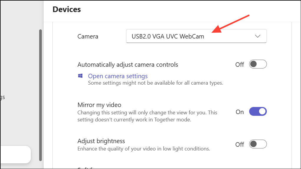 Step 2: Under the Camera and Microphone sections, select the correct device from the dropdown menus. Use the preview and test call features to verify that Teams recognizes and can use your devices.