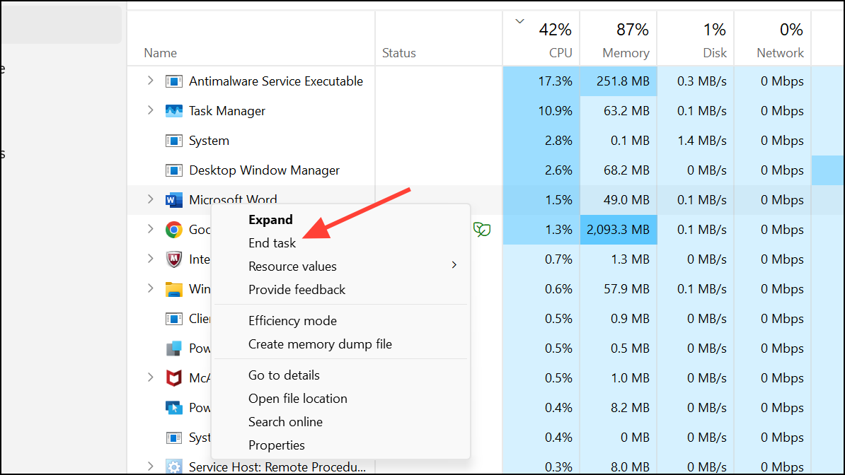 Step 3: Check if your system is overloaded by opening Task Manager (Ctrl + Shift + Esc) and viewing the Performance tab. If CPU, memory, or disk usage is near 100%, switch to the Processes tab, identify apps using high resources (such as browsers or games), and right-click to End Task for non-essential programs. This frees up memory and processing power for Word.