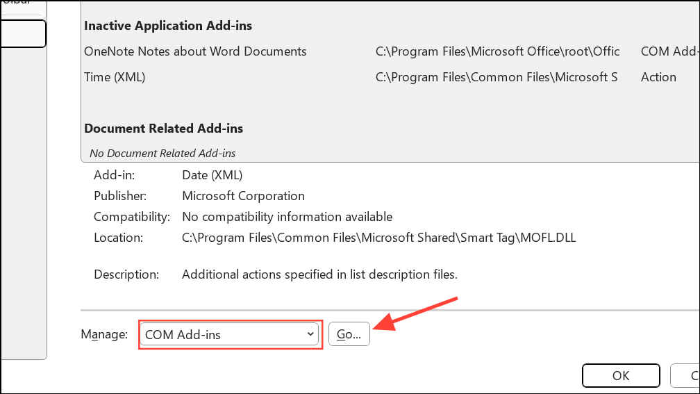 Step 3: At the bottom, set the Manage dropdown to COM Add-ins and click Go.