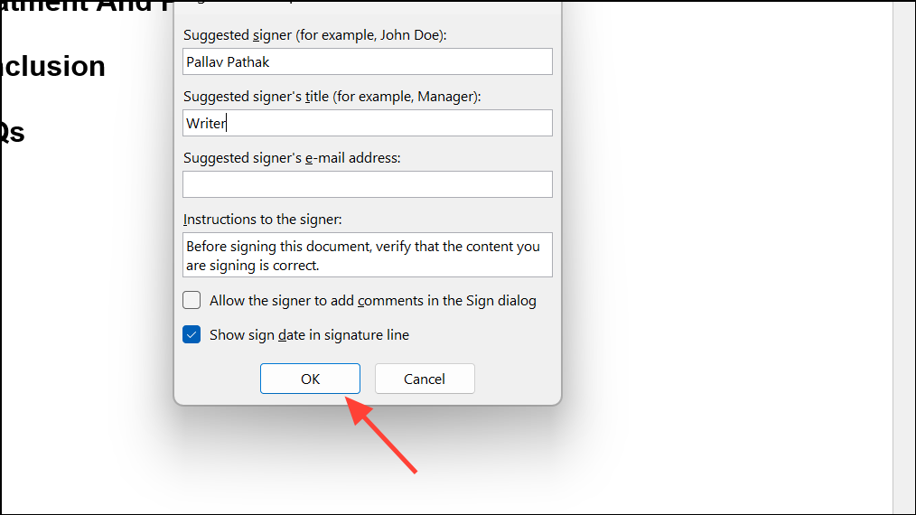 Step 3: In the dialog box that appears, fill in the details for the suggested signer and any additional instructions. This information helps identify who should sign the document and clarifies the signing process.