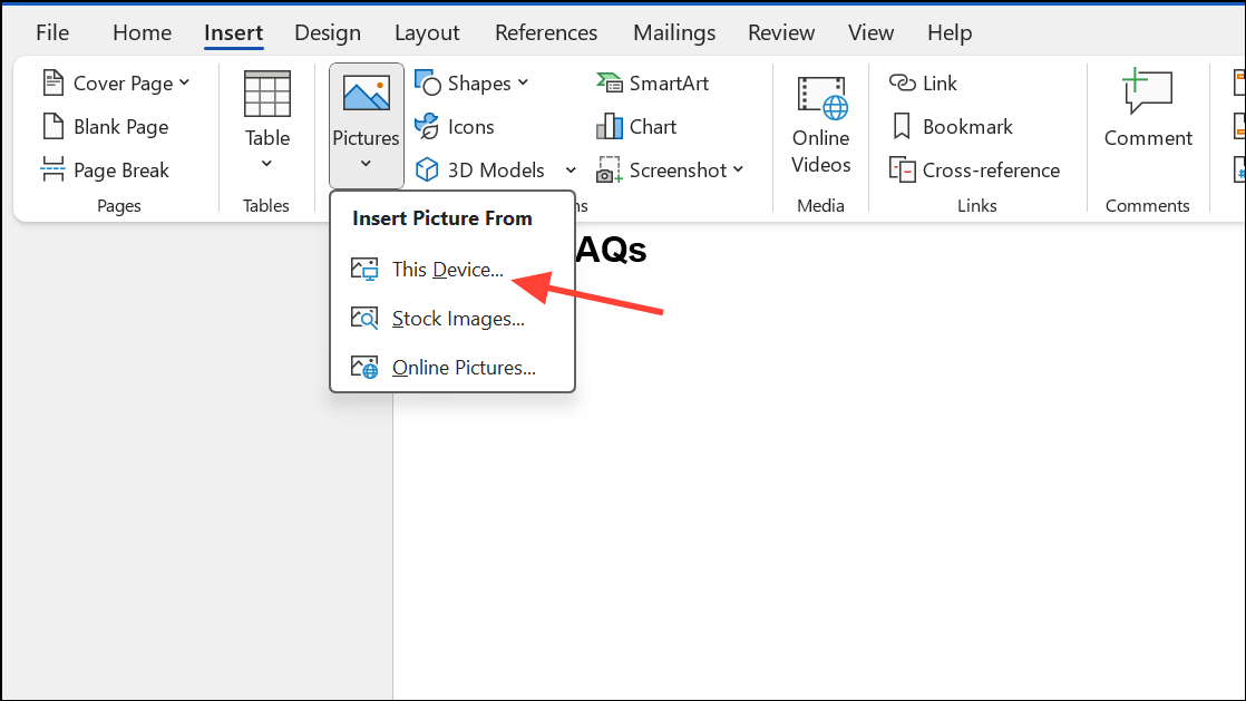 Step 3: Open your Word document, navigate to the Insert tab, and select Pictures > This Device. Locate your scanned signature image and insert it into the document.