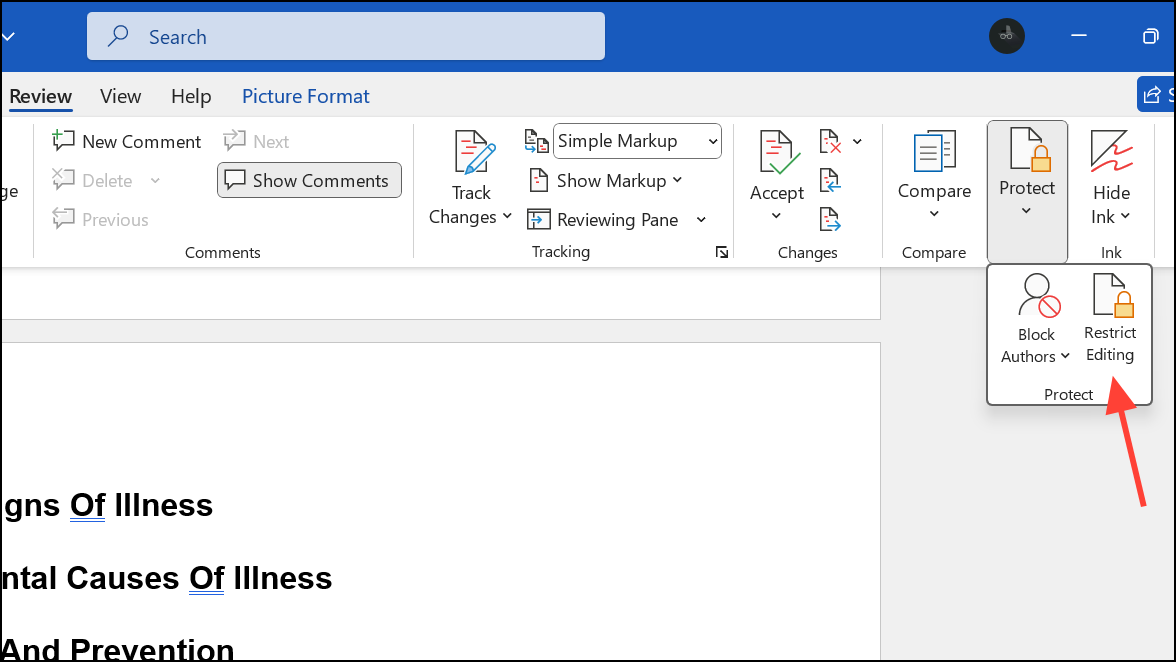 Step 3: Review document protection settings. Go to the Review tab and select Restrict Editing. If restrictions are active, disable them to allow signature line insertion.