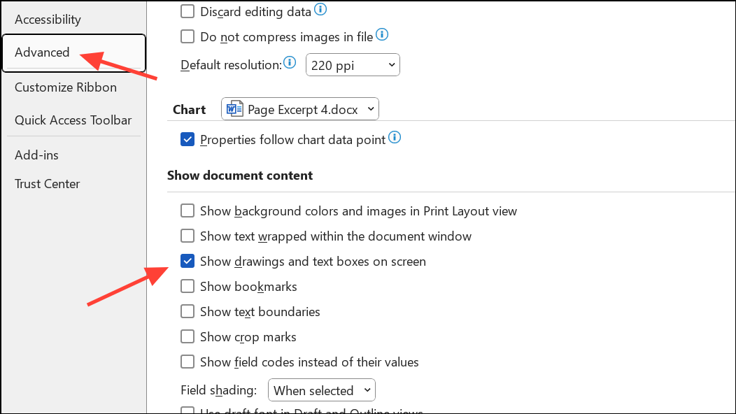 Step 4: If the signature line appears when printing but not on screen, check your display settings. Switch to Print Layout view and ensure that drawing objects and images are set to display in Word’s options: File > Options > Advanced, then scroll to Show document content and verify Show drawings and text boxes on screen is checked.