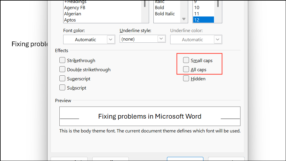 Step 3: In the Font dialog box, look for the “Effects” section and check if “All Caps” or “Small Caps” is selected. If either box is checked, uncheck it and click "OK" to apply the changes. This action immediately restores normal casing to your text.
