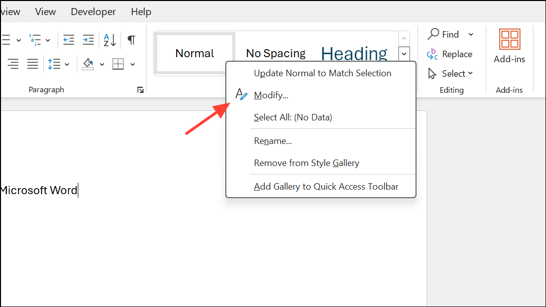 Step 4: If the issue persists, check the applied style. Click on the “Styles” pane in the Home tab, locate the style in use (such as “Normal” or a custom style), right-click it, and choose “Modify.”
