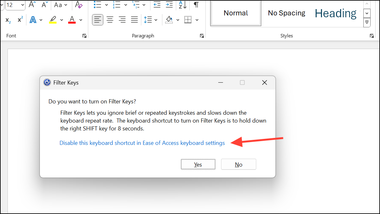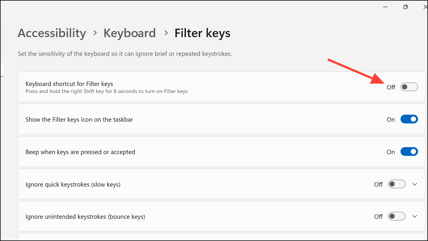 Step 2: Hold the right Shift key for 8 seconds to open the Filter Keys popup window. If the popup appears, click "Settings."