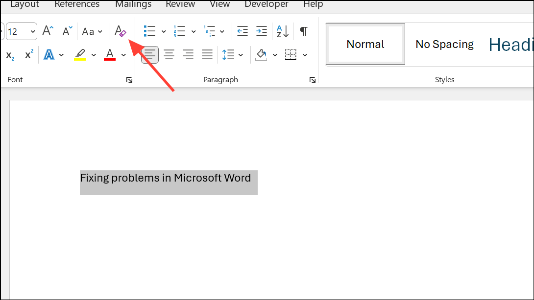 Step 2: Click the “Clear All Formatting” button in the Home tab (it looks like an eraser on an A). This action removes direct formatting, including forced uppercase.