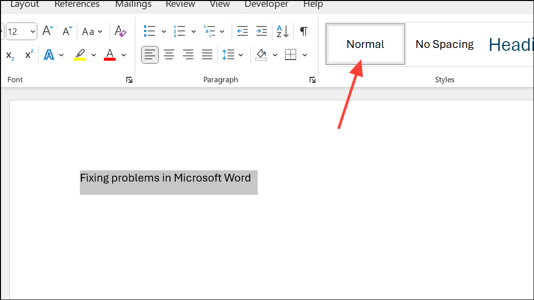 Step 3: After clearing formatting, apply the “Normal” style from the Styles group to reset the paragraph’s style. If the style name shows a suffix like “+AllCaps,” open the Styles pane, right-click the style, and choose “Delete” to remove the custom style. Reapply the standard style as needed.