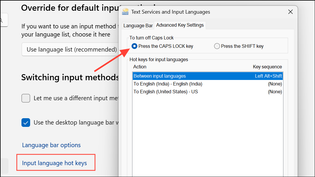 Step 3: Click “Input language hotkeys,” then in the new window, select “Advanced Key Settings.” Make sure “Press the CAPS LOCK key” is set for turning off Caps Lock, not “Press the SHIFT key.” Click "OK" to confirm.