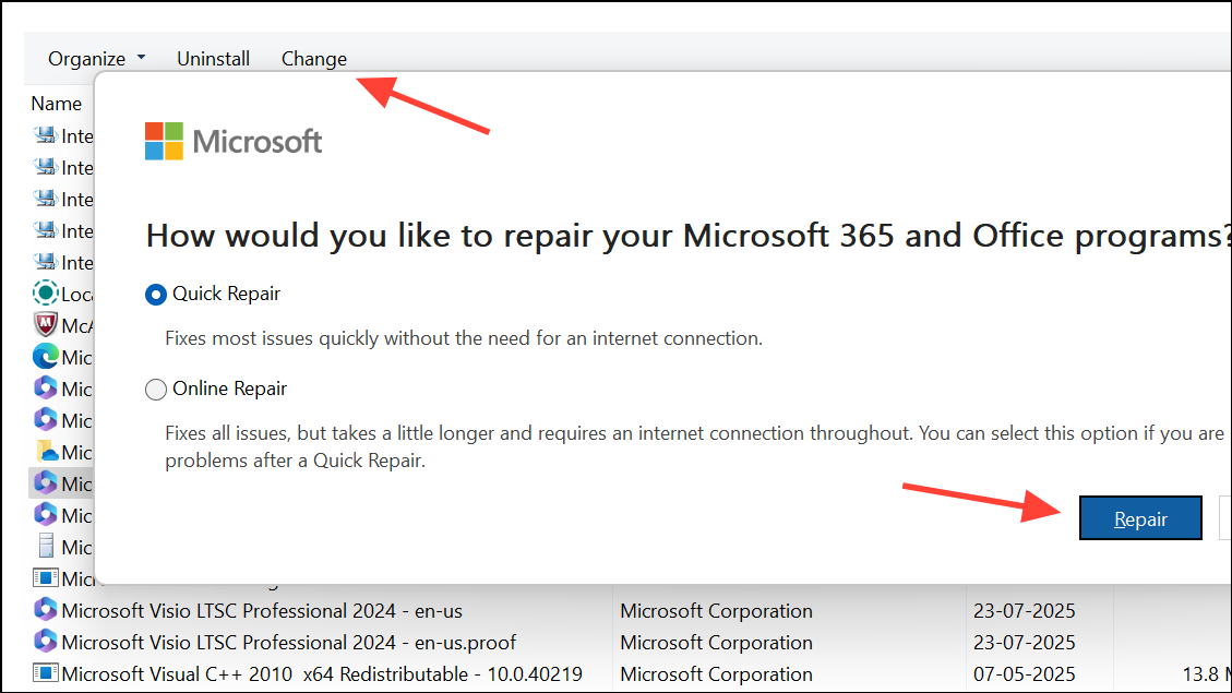Step 3: Select Microsoft Office, then click “Change” and choose “Repair.” Follow the on-screen prompts to complete the repair process.