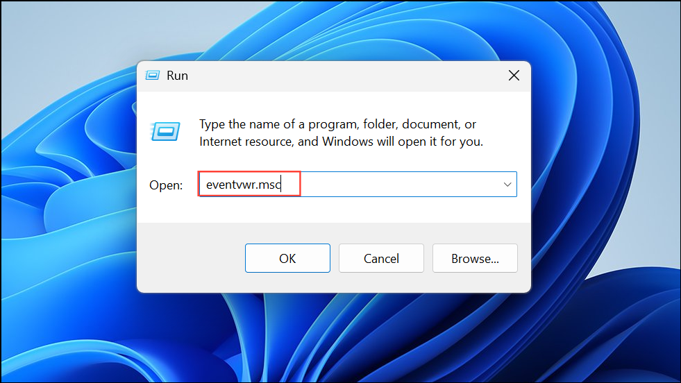 Step 1: Press Windows + R, type eventvwr.msc, and press Enter to open Event Viewer.