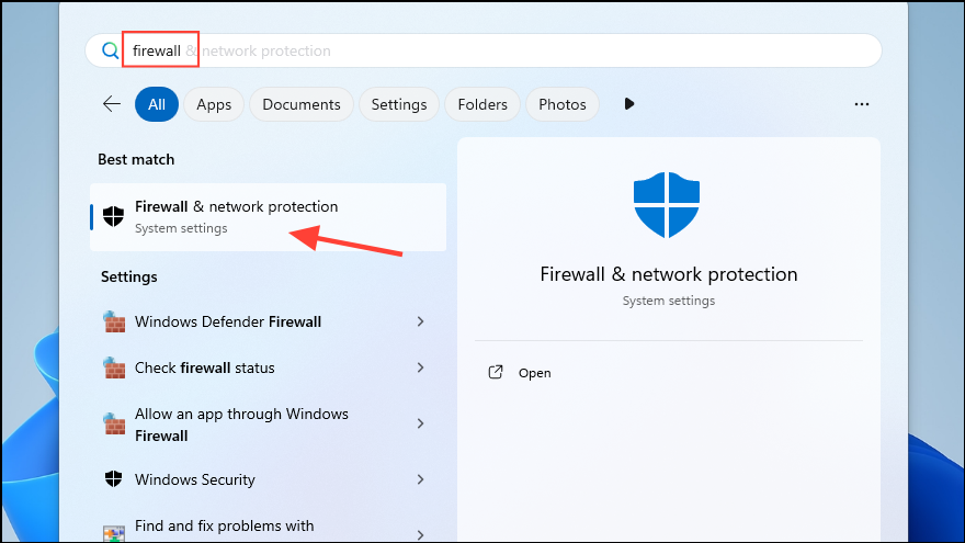 Step 1: Open the Start menu, type firewall and click on 'Firewall and network protection'.