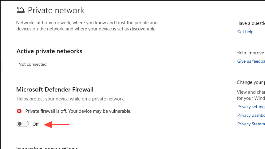 Step 2: Click Private Network and then click the toggle to turn off the firewall. Then go back and do the same for Public Network.