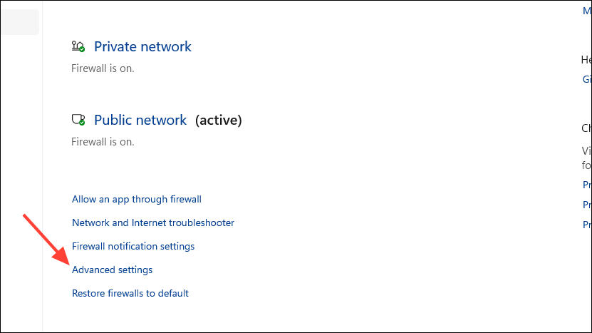 Step 3: If disabling the firewall resolves the issue, add Monster Hunter Wilds to your firewall's exception list instead of permanently disabling it. This allows the game to communicate freely with the server without compromising overall system security. To do so, click on Advanced settings on the firewall page near the bottom.