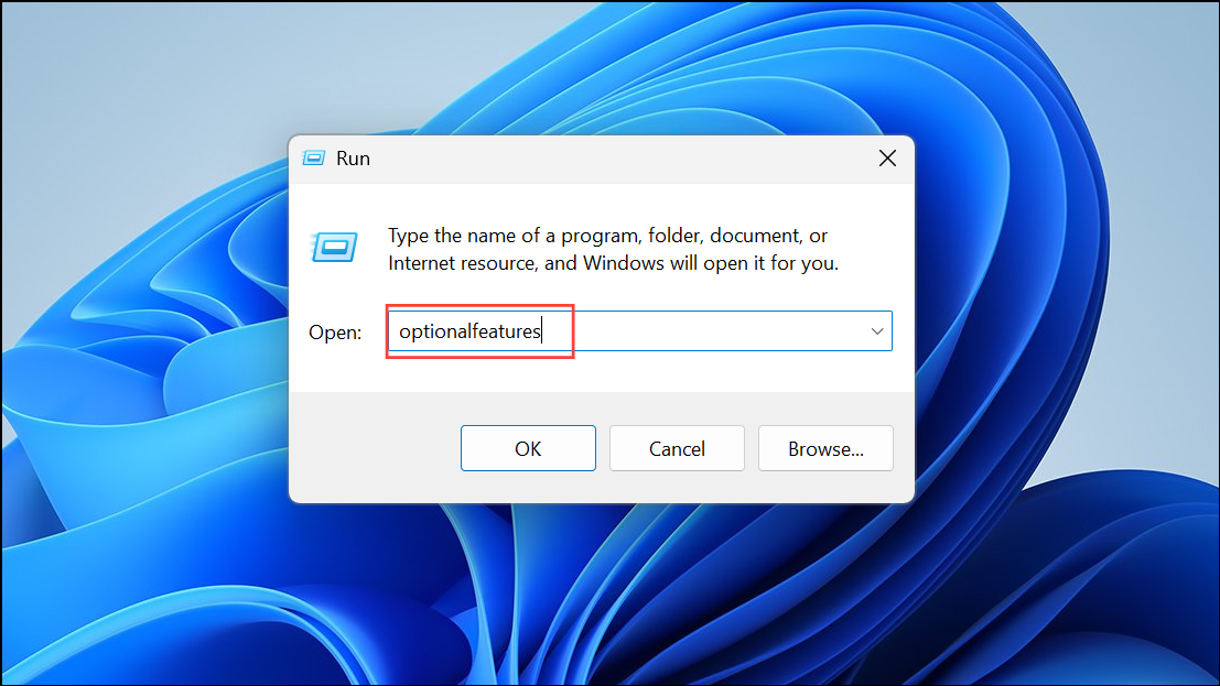 Step 2: Type optionalfeatures and press Enter to open the Windows Features window.