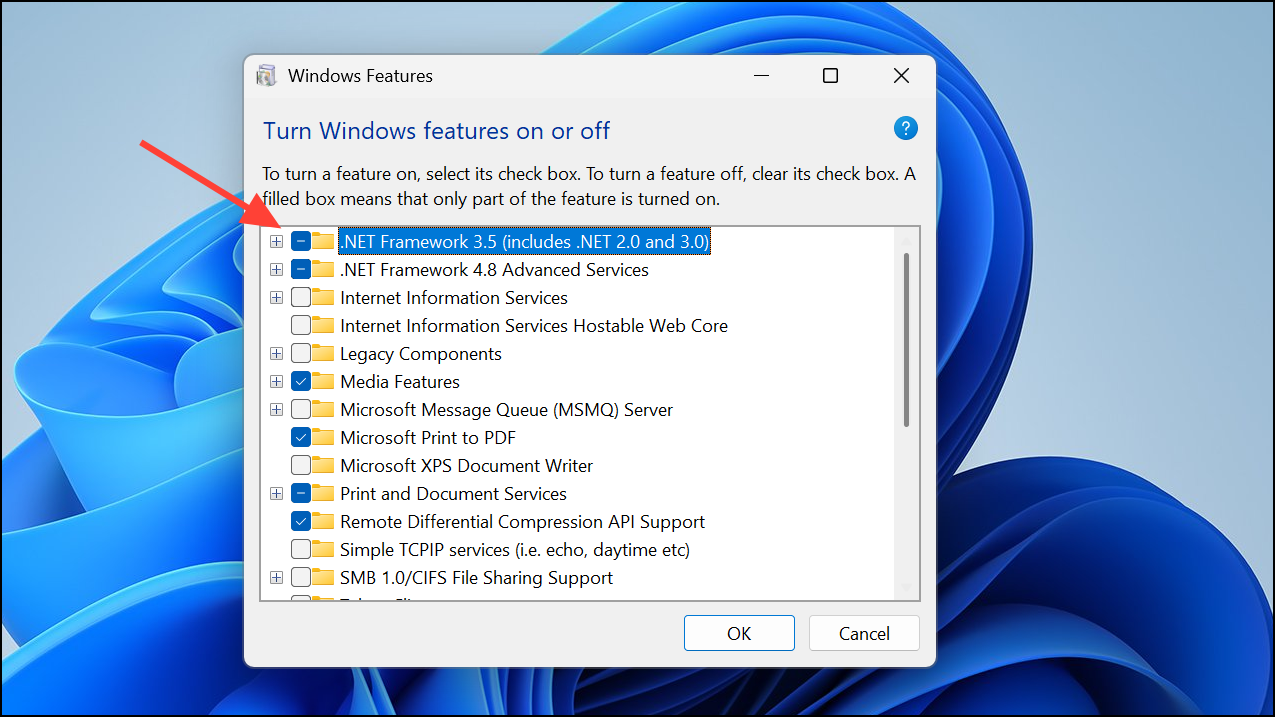Windows may have some .NET Framework components disabled by default, especially on newer versions. Enabling these options through Windows Features can resolve installation issues.