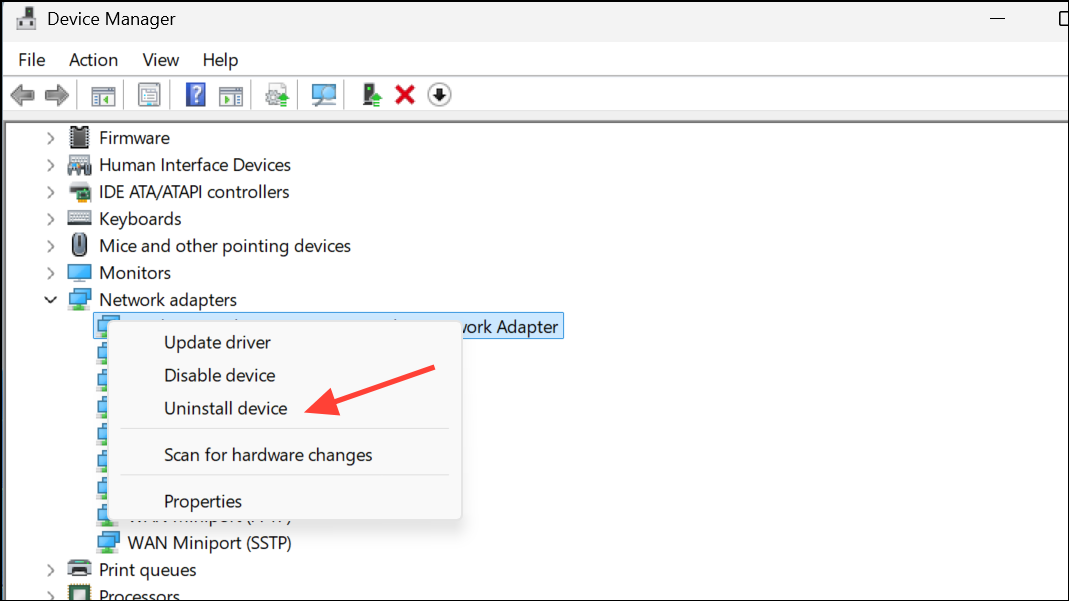 Step 1: If your adapter appears in Device Manager, right-click it and select Uninstall device. After uninstalling, reboot your computer. Windows will attempt to reinstall the driver automatically, which often resolves driver corruption issues.