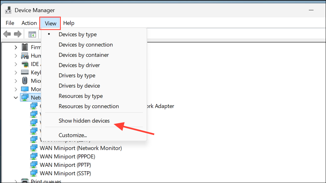 Step 3: If your adapter is missing, click View → Show hidden devices. Sometimes Windows hides disconnected or disabled hardware. Grayed-out devices can be right-clicked and re-enabled if possible.