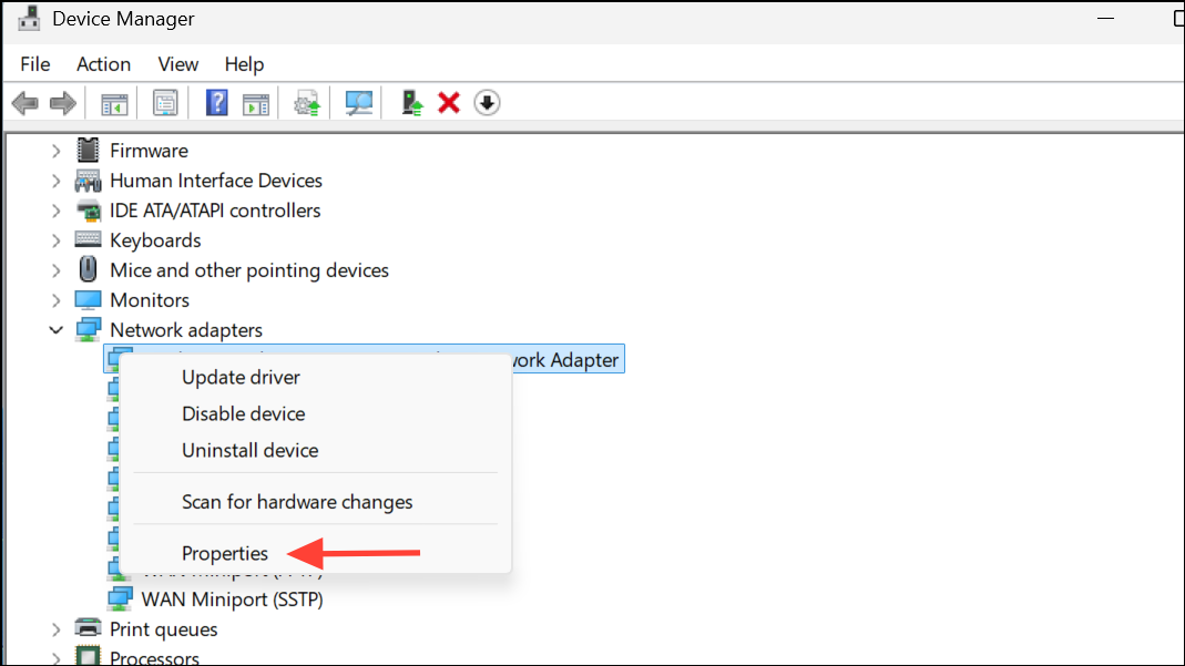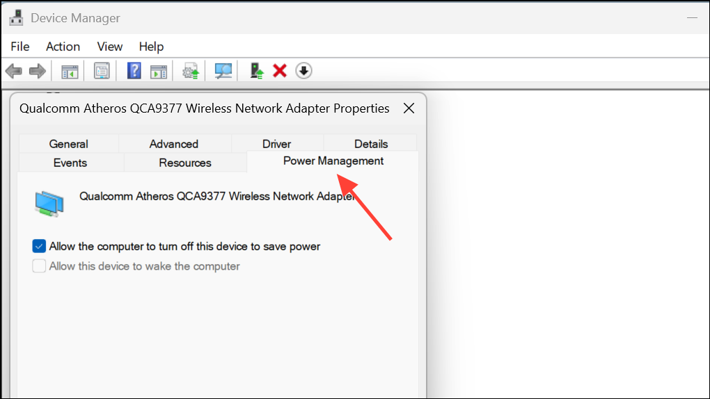 Step 1: Disable power management features that might cause the adapter to disappear. In Device Manager, right-click your network adapter, choose Properties, and open the Power Management tab.