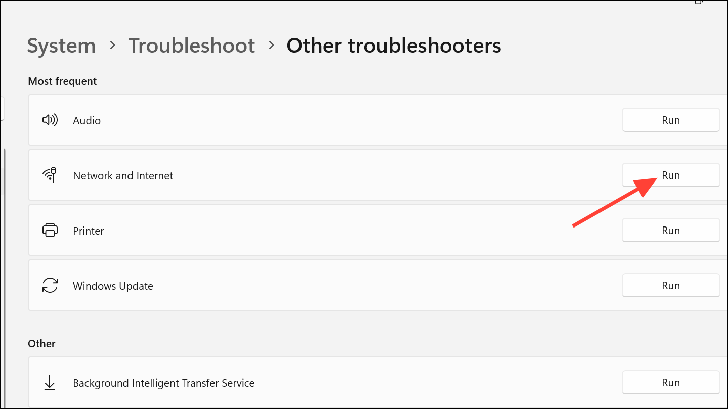 Step 2: Go to Other troubleshooters, then locate Network and Internet and click Run. This tool automatically scans for configuration issues and attempts to repair common network adapter problems, such as service failures or registry errors.