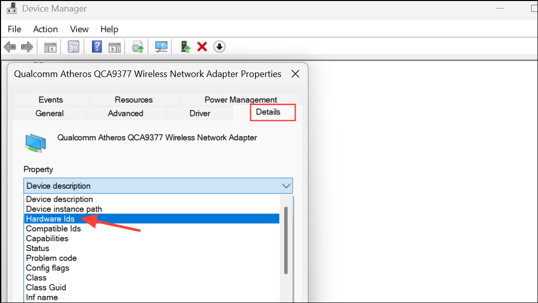 Step 4: For advanced troubleshooting, if you see an Unknown device or a device with a warning icon, right-click, select Properties, go to the Details tab, and choose Hardware Ids from the dropdown. Copy the displayed IDs and search them online to identify the correct driver.