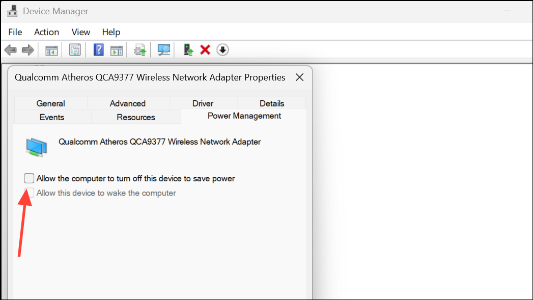 Step 2: Uncheck Allow the computer to turn off this device to save power. This prevents Windows from disabling the adapter to conserve energy, which can sometimes make it vanish from the system.