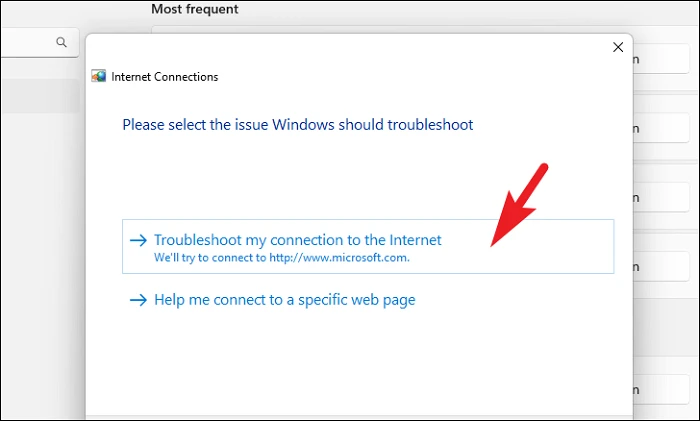 Step 5: In the troubleshooter window, select 'Troubleshoot my connection to the Internet'. The troubleshooter will attempt to detect and fix issues.