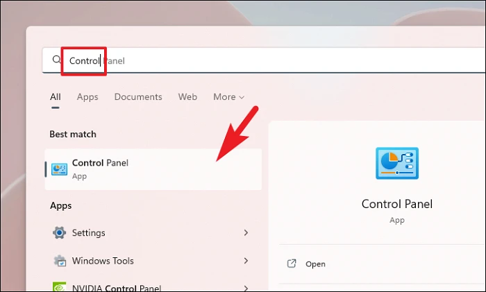 Step 1: Open the Control Panel by searching for 'Control' in the Start Menu and selecting 'Control Panel' from the results.