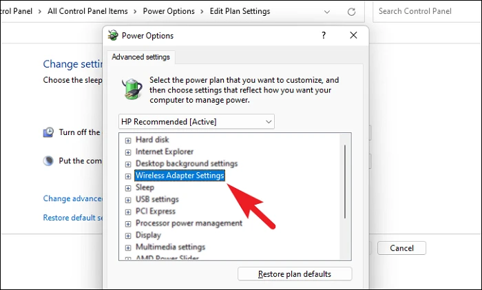 Step 5: In the Power Options window, expand 'Wireless Adapter Settings', then expand 'Power Saving Mode'.