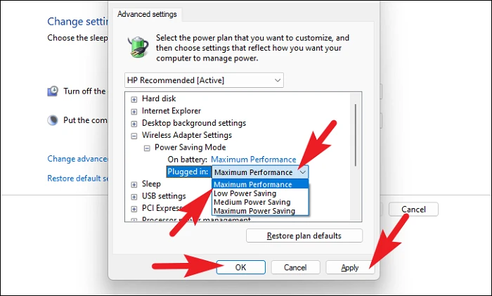 Step 6: For both 'On battery' and 'Plugged in', select 'Maximum Performance' from the dropdown menus.