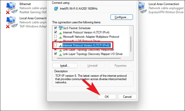 Step 5: In the Properties window, uncheck 'Internet Protocol Version 6 (TCP/IPv6)' and click 'OK'.