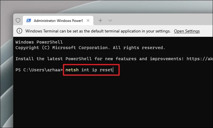Step 4: Type or copy and paste the following command and press Enter to reset the TCP/IP stack:
