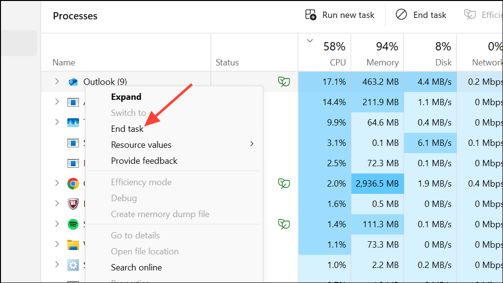 Step 3: Select each relevant process and click End Task. This ensures Outlook is fully closed and not stuck in a suspended state.