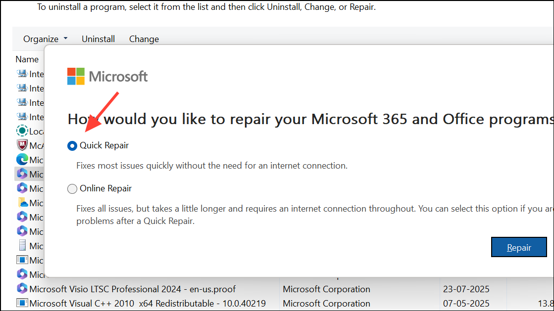 Issues with the Microsoft 365 suite can cause Outlook to malfunction, especially after a failed update or interrupted installation. Repairing the suite replaces missing or corrupted program files.