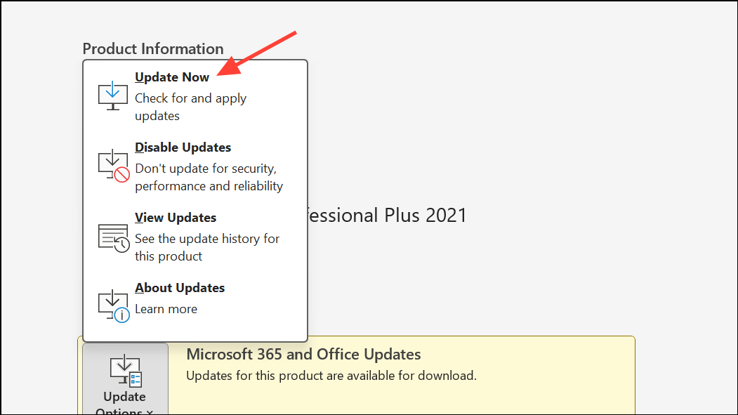 Step 2: For Office updates, open any Office app, go to File > Account, then click Update Options > Update Now. This downloads and installs the latest Office patches.