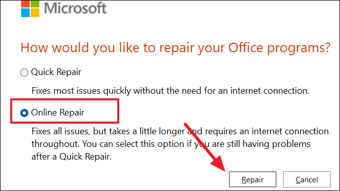- On the pop-up window, choose 'Online Repair', and click 'Repair'.