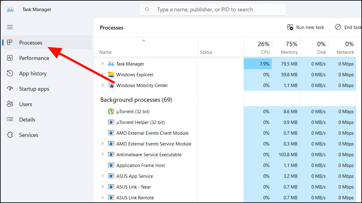 Ctrl+Shift+Esc. - Move to the 'Processes' tab and look for the 'Microsoft Outlook' process from the list.
