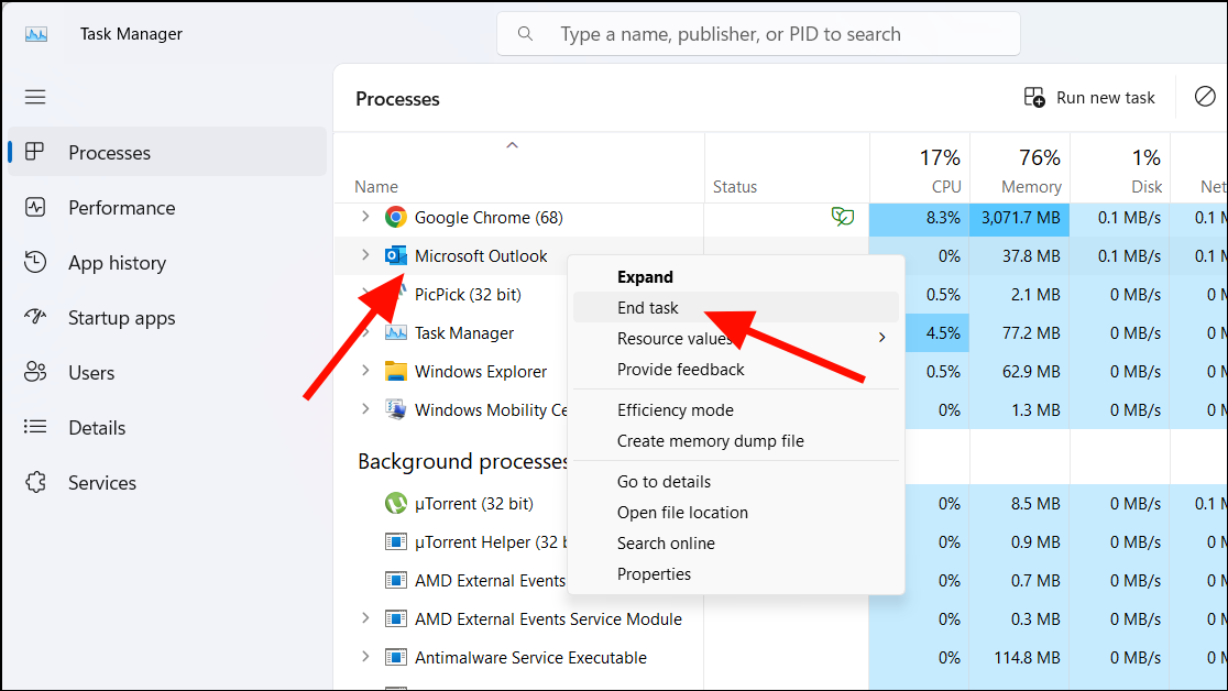 - Then, right-click the 'Microsoft Outlook' process and select 'End task'.