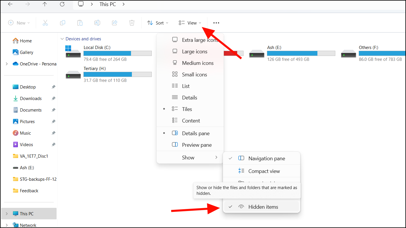 - Open File Explorer, click the 'View' menu on the menu bar, move to 'Show', and click on 'Hidden items' to view hidden folders and files. If the 'Hidden items' option already has a tickmark next to it, skip this step.