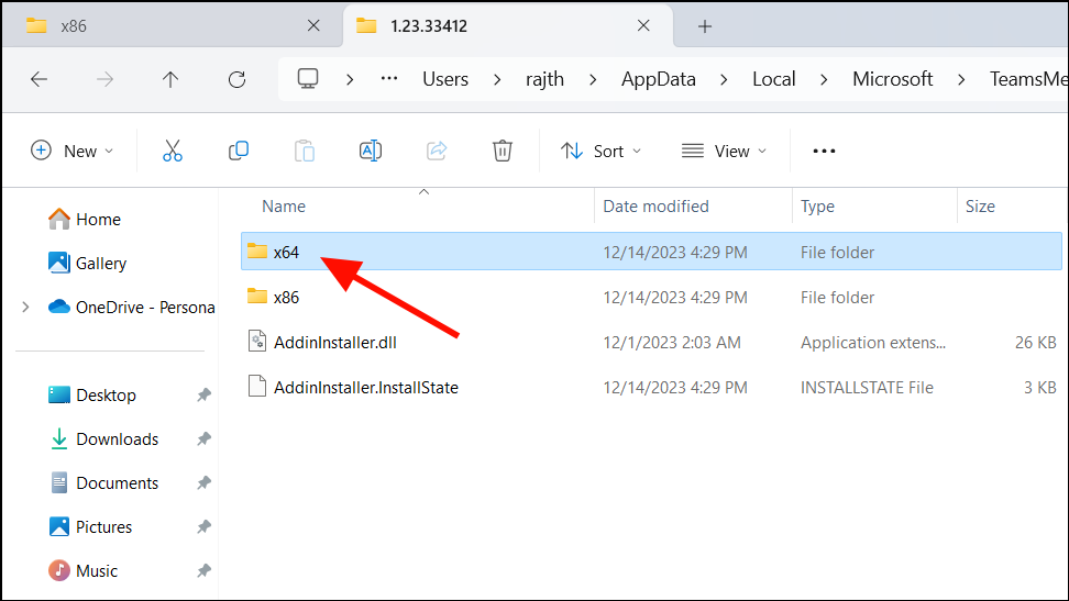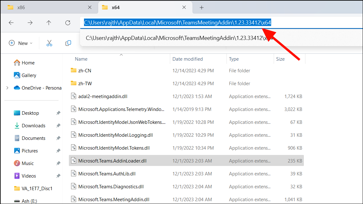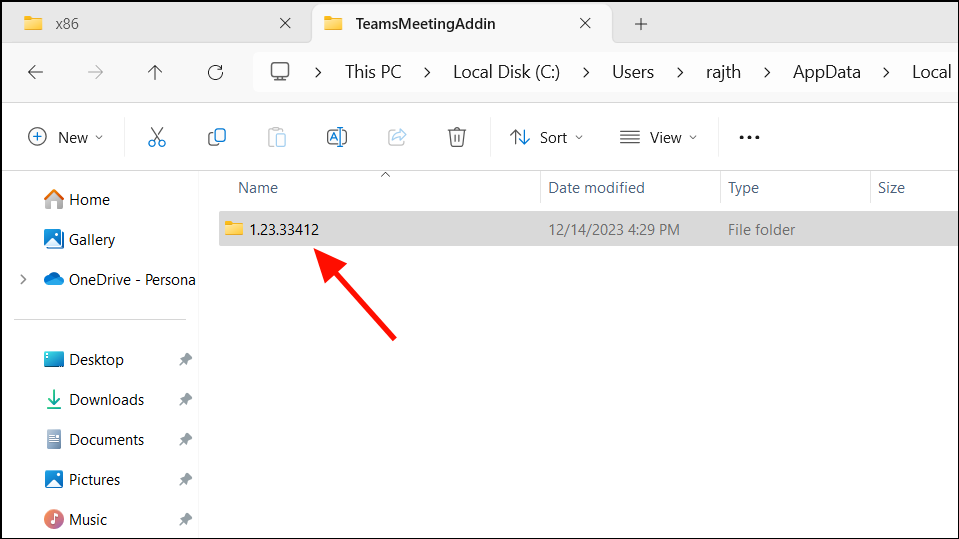 AppData\Local\Microsoft\TeamsMeetingAddindirectory. You'll find a folder named with a version number like '1.23.33412'. Open this folder.